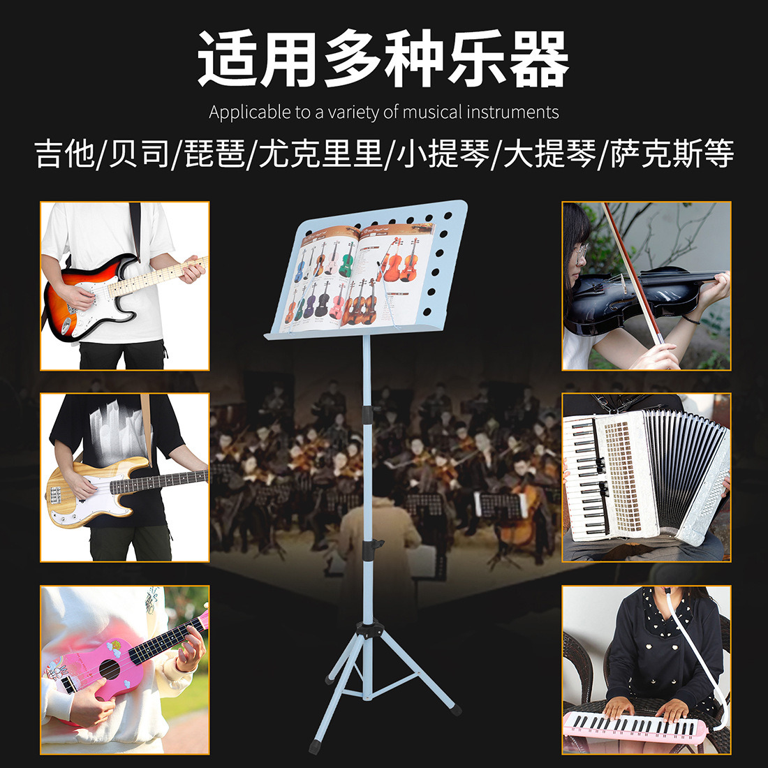 Use selling point: Suitable for professional/practice/performance, strengthening triangular structure, stable chassis, free height adjustment, more freedom to see the spectrum, large area thickened panel, comfortable large space, more convenient to see the spectrum, suitable for a variety of instruments